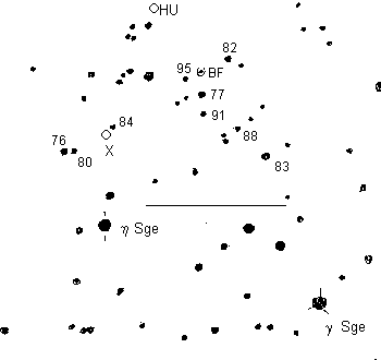 A deep red, but rather faint, variable in a beautiful field, which includes two other binocular variables; X Sagittae is a star similar to BF, but slightly fainter at minimum, and HU Sge is a red irregular variable with a small range, though the brightest of the three. The magnitudes of the stars close to BF are from the AAVSO preliminary (b) scale chart for TX Sge, a faint Mira star in the area, though star 82 near BF and the remaining stars are from my own visual estimates.