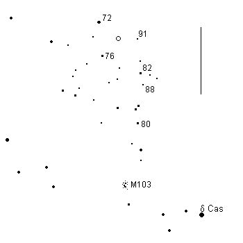 A deep red variable located in a rich field of clusters near the naked-eye star delta Cas. Having found M103, go two degrees north and find the variable with reference to the 72 comparison star. Observe once a month.