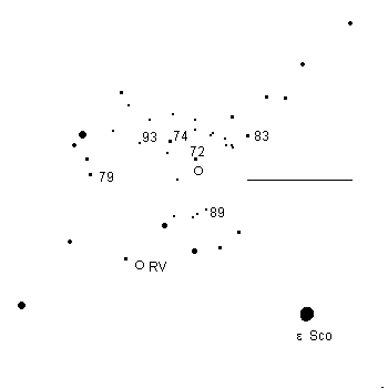 A nebular variable, of which there are many in this brilliant constellation. This is one of the brightest, though it is at the limit of faintness for average glasses when it fades to minimum. Nearby is RV Sco, a Cepheid variable with a 6 day period and range from 7th to 8th magnitude.
