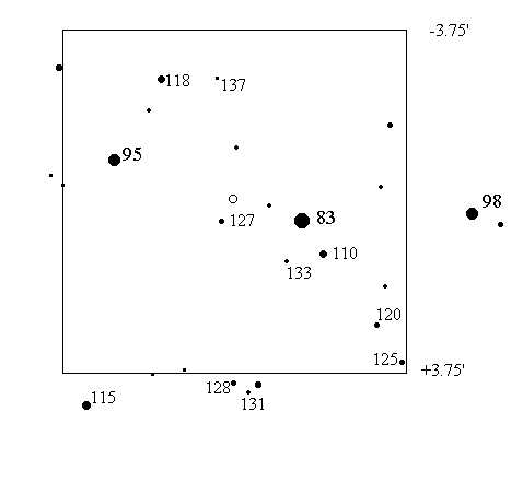 An RV Tauri star with a period of 65.4 days and a visual range of about 11 to 13. Note that this is an (f) scale chart - i.e., zoomed in on a very small area of sky.