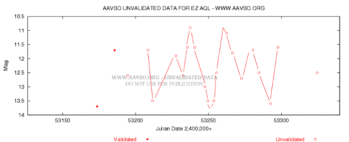 As far as I know, this has the shortest period of any RV Tauri star, just 38 days. It lies in a most recognizable little group of stars, including a tiny line of 12.7, 13.1 and 13.4 only a minute of arc to the North. It has a range of 11.6 to 13.6 and lies in a crowded field not far from Altair. You may be able to notice its yellow-gold colour when it is bright. This is a fairly underobserved star which is on the preliminary programme of the AAVSO. I have joined the points by lines (as there are relatively few data points due to this star being not very well observed) to show the variations.