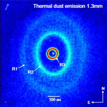 This bright YSO in Ori T1 (the star formation region around λ Orionis) gets the 'my favourite object' treatment by Prof. Stefan Kraus of Exeter University here in the UK, which is quite a centre of YSO studies. He describes it as a pre-main-sequence triple with a warped disk and a torn-apart ring and is a hint - if any were needed - that star formation is a very violent process! For instance, he cites the phenomenon of disc tearing that might occur in the discs around multiple stars whose orbital angular momentum vectors are misaligned with respect to the rotation axis of the disc. All 3 stars are slightly more massive than the Sun while remaining T Tau stars. The A and B stars show a 242-day orbital period while the more eccentric, and inclined C orbits A and B in about 11 years, while both components (A/B and C) have their own circumstellar discs. Three large dust rings were detected using ALMA and some idea of the size of the system can be got from the scale in the graphic.