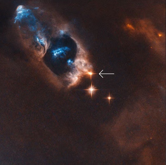 This extremely interesting system resembles to some extent TV Crt which we have been featuring for a while now. It is a binary star, both components of which have their own independent planetary systems - but there may also be a third system orbiting farther out. The two T Tau components are about 14 billion km apart and the total mass of the stars comes to just under 1 solar. They are also attended by a dynamic Herbig-Haro flow HH7-HH11 which can be seen forming a bowshock in the nebular material.